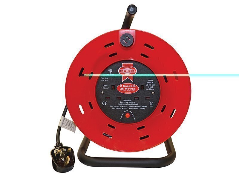 Faithfull Open Drum Cable Reel with twin 240V sockets. The 1.25mm² cable is fitted with a standard 240V plug. For added safety, the reel is fitted with a thermal overload protection system to prevent overheating damaging the cable when in use. The heavy-duty plastic drum is mounted on a sturdy steel frame with a textured grip for user comfort. Complies to BS EN 61242.