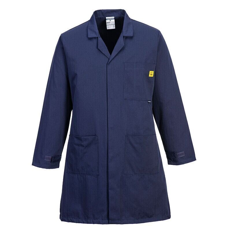 Anti-Static ESD Coat This inherently anti-static coat is ideal for environments where electrostatic resistance is required. Designed with safety and comfort in mind. Features include concealed stud front, two lower patch pockets, one chest pockets and adjustable cuffs.