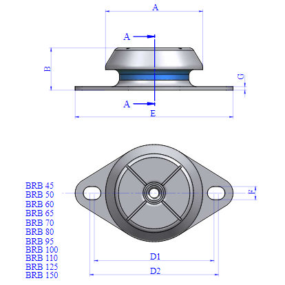 The BRB type AMC MECANOCAUCHO mounts are antivibration elements which work the rubber in shear and compression. Their tall height section produce large deflections, low natural frequencies, and excellent vibration isolation results. This range of mounts is suitable for applications where high vibration isolation in the 85-95% range is a priority.