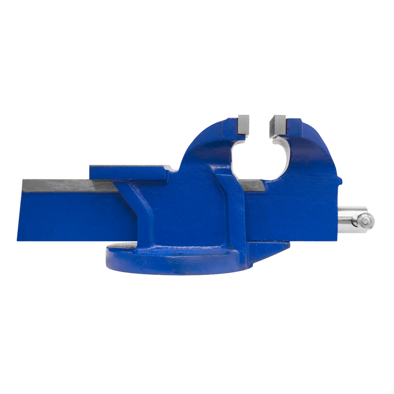 Bench mounting vice with cast iron body and replaceable, serrated steel jaws.Smooth rolled thread for accurate clamping.