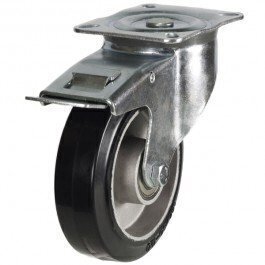 Black elastic tyre industrial castor complete with aluminium centre and pressed steel bracket. It has a swivel top plate type fixing, complete with brake and ball bearing. It is hard-wearing and is ideal for trolleys.