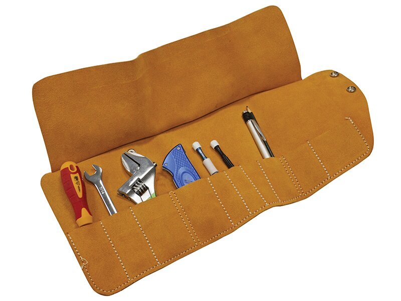 The Faithfull 10 Pocket Leather Tool Roll is manufactured from high-quality leather. Contains ten pockets of various sizes and is ideal for storing small tools such as chisels, auger bits, screwdrivers and spanners. It has a stud fastening system for ease of use.