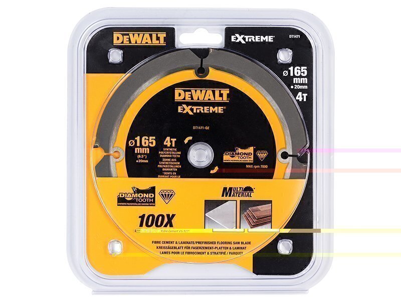 The DEWALT Extreme Cement Saw Blade features synthetic PCD (Polycrystalline Diamond) tipped teeth. These PCD coated teeth provide 100% longer life in fibre cement than TCT tipped blades. The laser cut blade features anti-vibration body slots and precision ground tips. The blade design also helps to reduce dust production when cutting fibre cement materials.