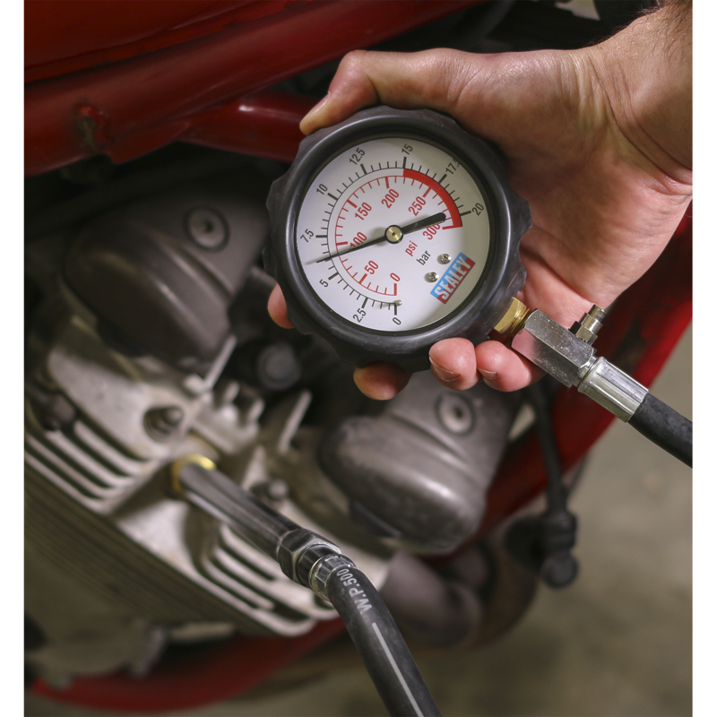 Features 300psi gauge with large rubber bumper. Includes extension for deep-seated plugs and flexible extension hose.Suitable for petrol engines with 10, 12, 14 and 18mm spark plug threads.