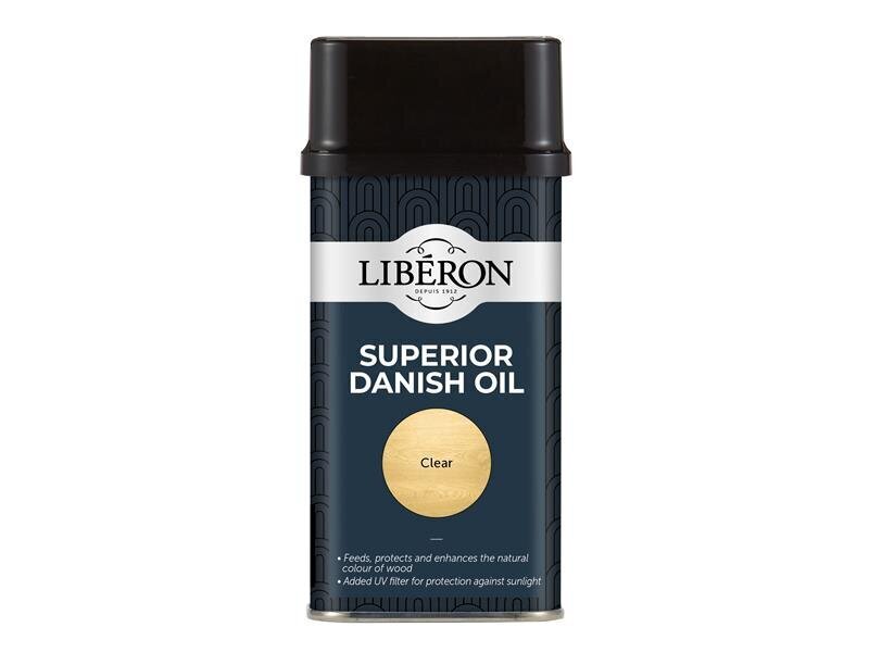 Liberon Superior Danish Oil is a blend of pure, high quality Tung oil and natural oils which feed, enhance and protect hard and soft woods. It is a penetrating oil, which brings out the natural grain of the timber and provides a satin to gloss sheen. With added UV filters to help prevent discolouration from the sun, and water, heat and alcohol resistant, it is suitable for both interior and exterior use.