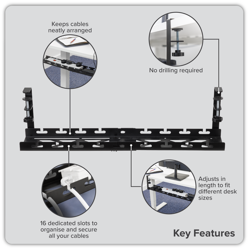 EXTENDABLE DESIGN - Adjusts in length to fit different desk sizes and accommodate various cable needs.ORGANISED - Keeps cables neatly arranged, preventing tangling and clutter under the desk.