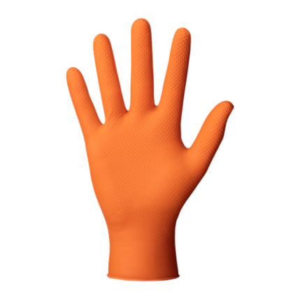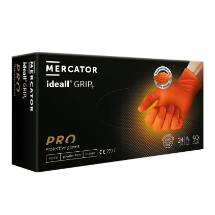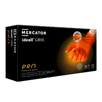 The Mercator Medical Orange Ideall Grip is a 7.0 mil, 8.6 gram, 240mm long orange nitrile, type B glove. This product features a diamond texture grip on the inner and outer offering great traction grip.
