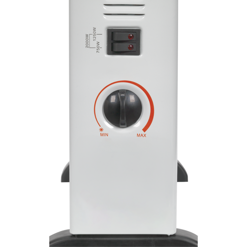 Three heat settings of 750/1250/2000W for gradual control of heating elements.Rotary controlled room thermostat maintains ambient temperature at preset level.