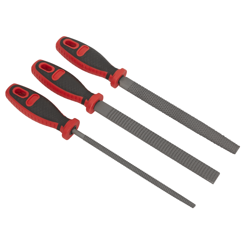 CONTENTS - 1pc Flat Rasp 200mm, 1pc Round Rasp 200mm, 1pc Half Round Rasp 200mm.