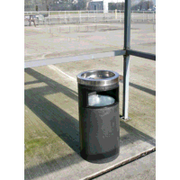 Metal construction with black powder coated body with side-opening and aluminium lid featuring built-in ashtray.Supplied with removable metal inner liner and carry handle making emptying quick and easy.