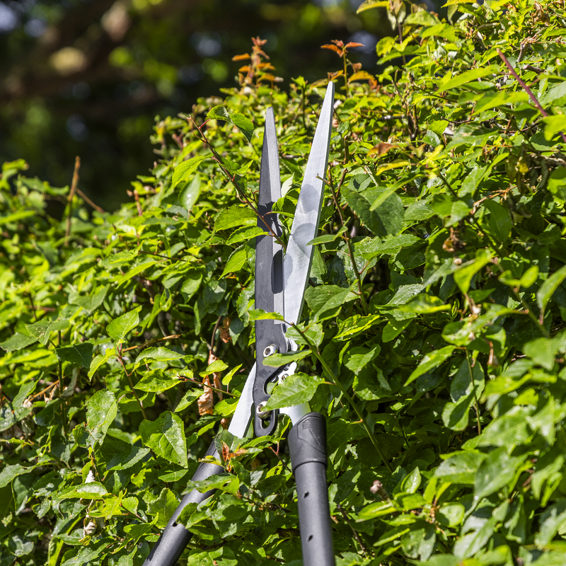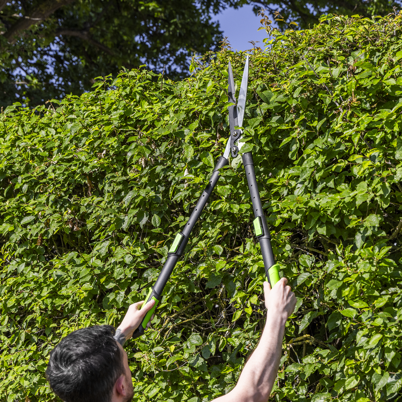 POWDER-COATED STEEL HANDLES Adjustable length for extended reach and improved leverage, perfect for high or dense hedges.