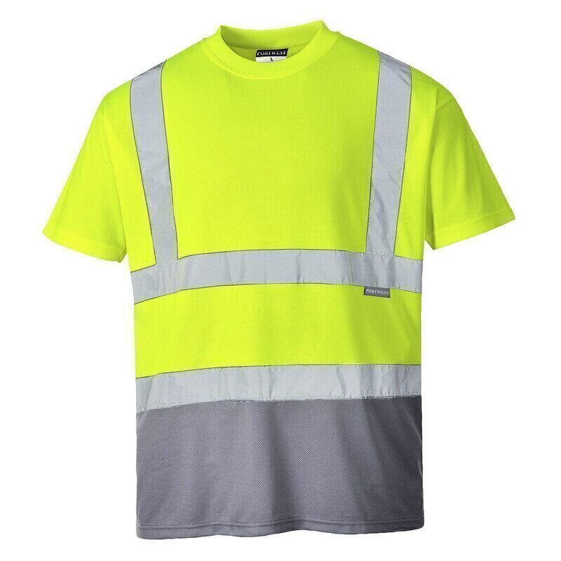 Hi-Vis 2-Tone T-Shirt This two-tone combination T-shirt offers a generous fit and allows for maximum movement in any working environment. The standard reflective tape configuration ensures maximum visibility for added safety.