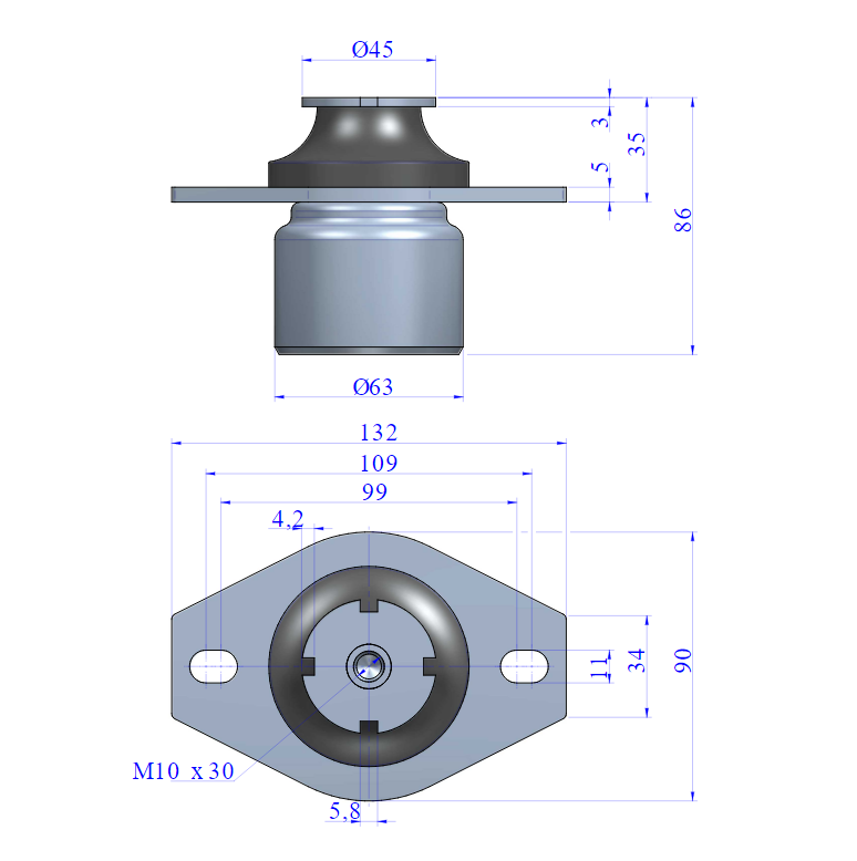 For good isolation, low damping is required. For motion control, high dampening is required. The MECANOCAUCHO hydraulic mounts accommodate these conflicting requirements. The fluid cavity is divided into two chambers with an orifice in between, so that motion of the elastomeric element causes fluid to flow from one chamber to the other, dissipating energy and this creating damping in the system.