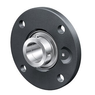 Normal duty four bolt round flanged bearing unit complete with grub screw bearing insert with P seals. The cast iron housing includes a grease nipple for re-lubrication.