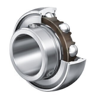 INA bearing insert with spherical outer ring, location by grub screws and P seals on both sides.