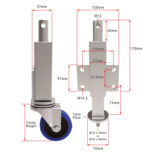 Please note: Jacking castors are rated on a different principal to other castors and we recommend the total lifted load is divided over just 2 jacking units. An extra safety point is when jacked up please beware of any obstacles as a sudden shock could result in the inner square tube bending around the outer tube.