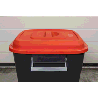 Durable refuse/storage bin made from polypropylene. Fitted with lid latches to keep lid secure and carry handles.
