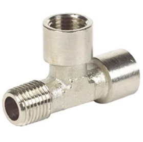 High quality Sistema Pneumatica nickel plated brass tee fitting featuring one male run and two female ports. This threaded adaptor is precision engineered with BSPT male thread and BSPP female threads for reliable pneumatic connections.