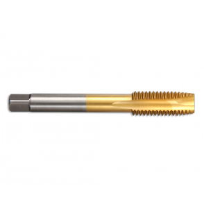 Metric coarse spiral point machine tap with straight flutes for working in steel up to 750 N/mm2. Swarf is forced forward in the direction of the cut. TiN coating provides longer tool life.