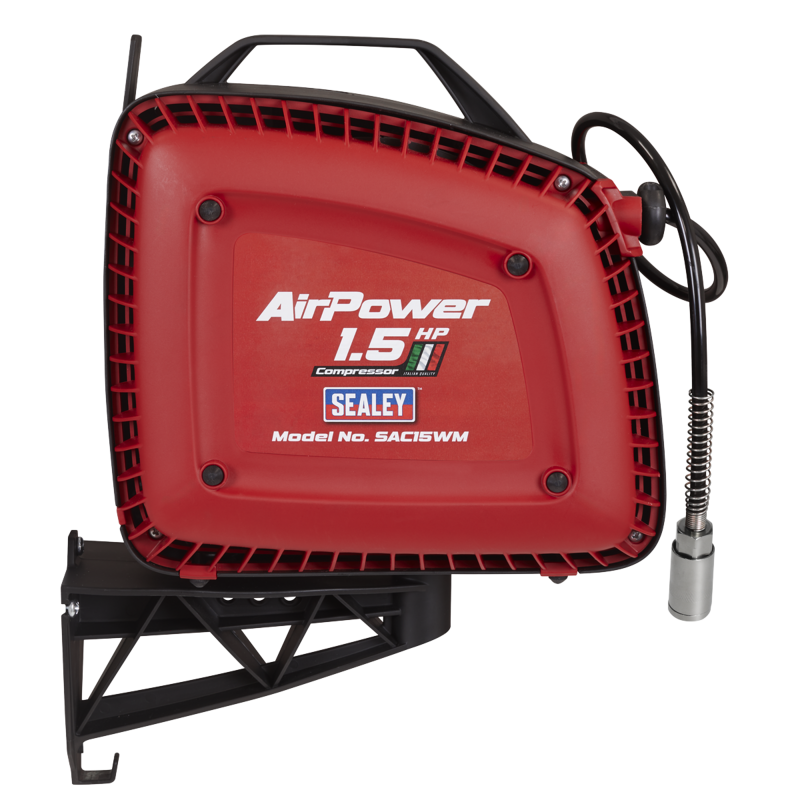 ALL-IN-ONE UNIT - Compact air compressor with integral 7m hose reel.SWIVEL WALL MOUNTS Features 180 rotation to prevent snagging.