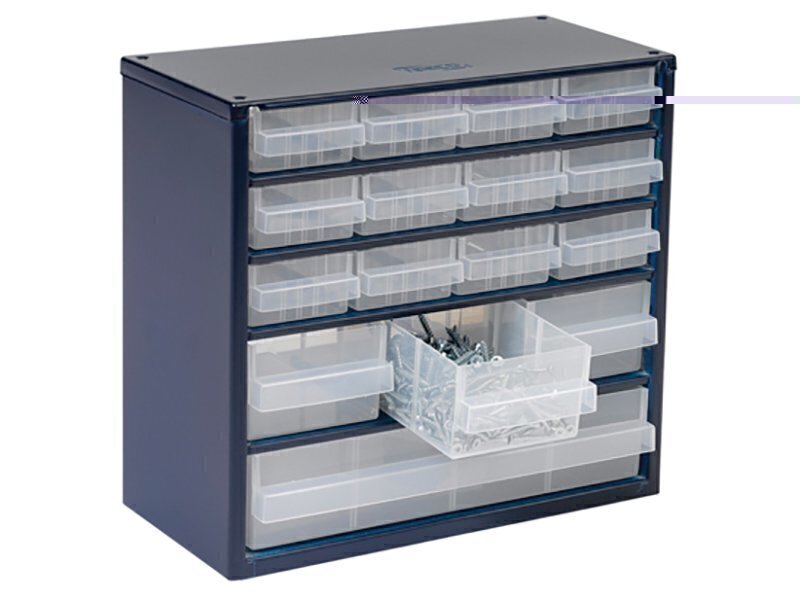 The Raaco 616-123 Metal Cabinet has 16 assorted drawers for a variety of storage options. The cabinet is made of painted steel and the drawers are made of polypropylene (PP).