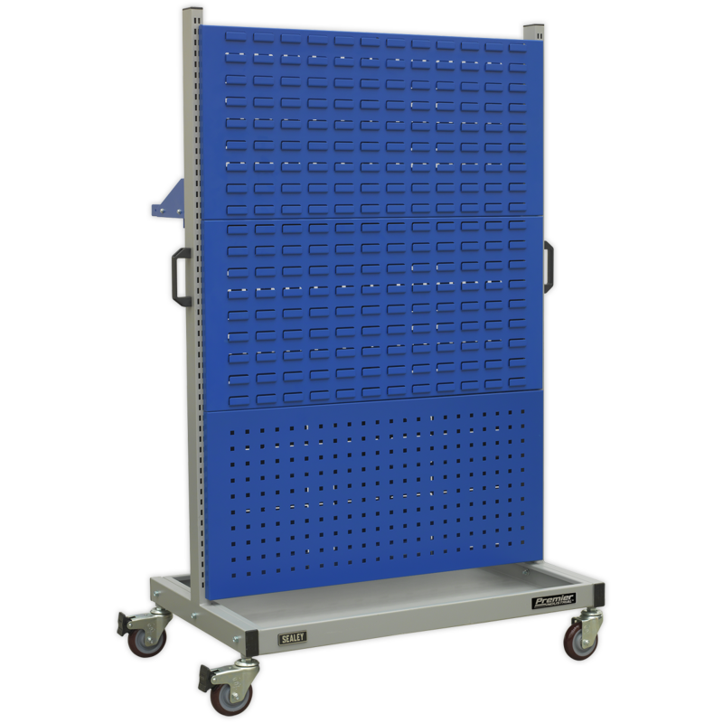 Industrial quality mobile storage system for use in the garage or workshop environment.Supplied with six panels three louvred, to accept storage bins, and three perforated, which can be used with Sealey TTS Series clips for tool storage.
