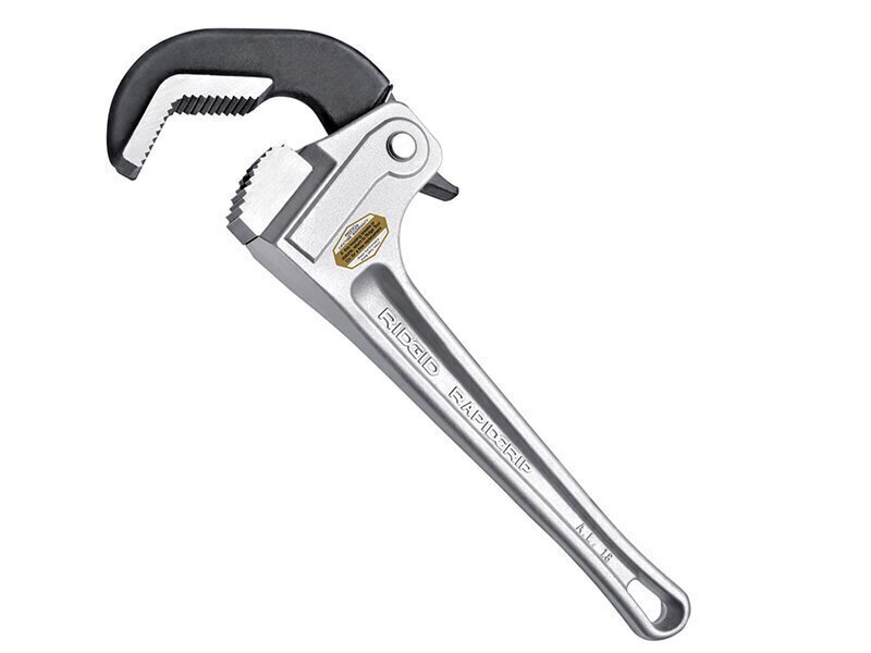 The RIDGID Aluminium RapidGrip® Wrench has all the great benefits of the heavy-duty RapidGrip® wrench but it is 35% lighter than heavy-duty models. It offers quick one-handed operation with a spring-loaded jaw design that provides a rapid ratcheting action. The unique combination heel/hook jaw design bites the workpiece aggressively and ensures a secure grip.