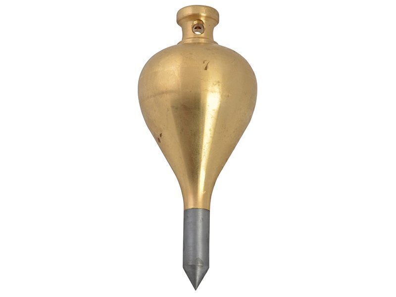 Monument Brass Plumb Bob that has a solid brass body with steel point and a hole for attachment to a line.