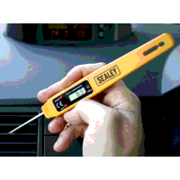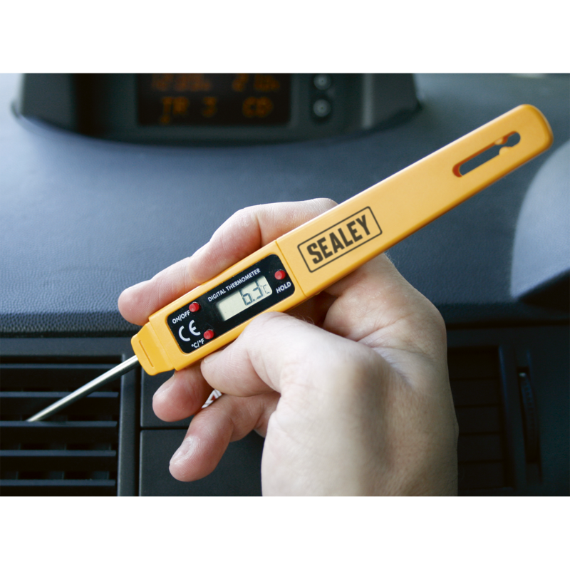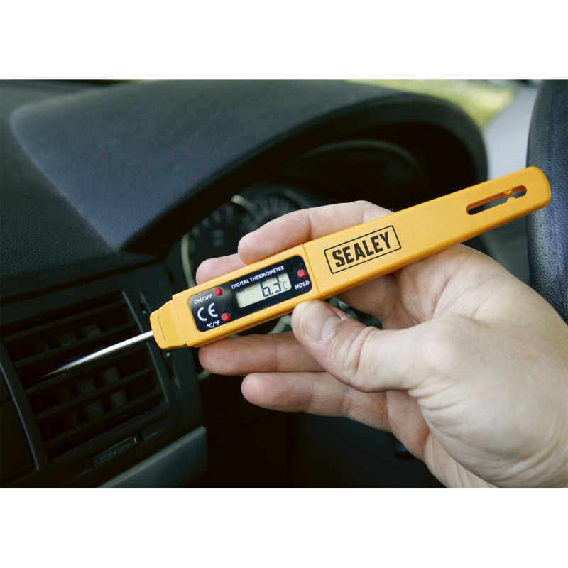High precision digital thermometer with the sensor located in the tip of the stainless steel probe.Compact and lightweight measuring both C and F with hold function.