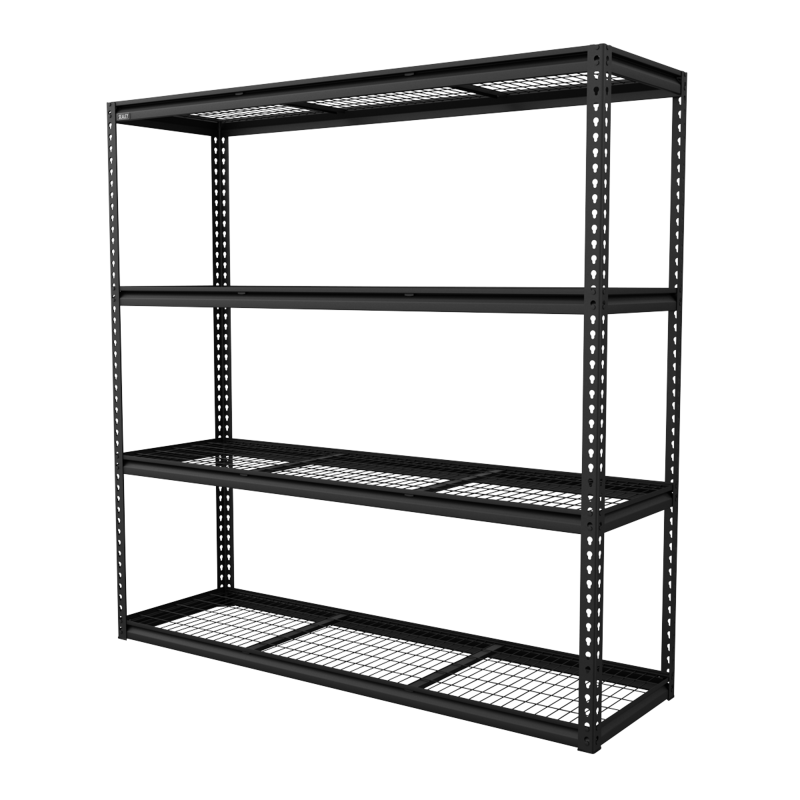 WORKSHOP READY - Textured powder coat steel frame with four heavy-duty powder coated steel mesh shelves.
