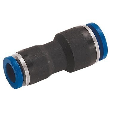 A high-quality metric reducing coupling designed for pneumatic applications, allowing seamless connection tubing. This straight connector features a robust plastic/brass nickel plated construction in a distinctive black and blue finish.
