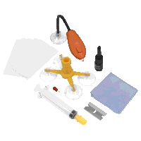 CONTENTS - Push Pin, Cleaning Cloth, Repair Pedestal, Razor Blade, Repair Resin, Injector Syringe, UV Light, Curing Film (x5), Instruction Manual.