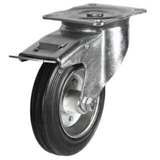 Black tyre and steel centre industrial castor with zinc plated housing.