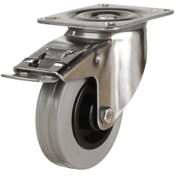 Grey rubber tyre industrial castor complete with plastic centre and Stainless Steel housing. It has a swivel 4 bolt hole type fixing and is braked. It is hard-wearing and is ideal for many applications especially for Marine & Food industries.