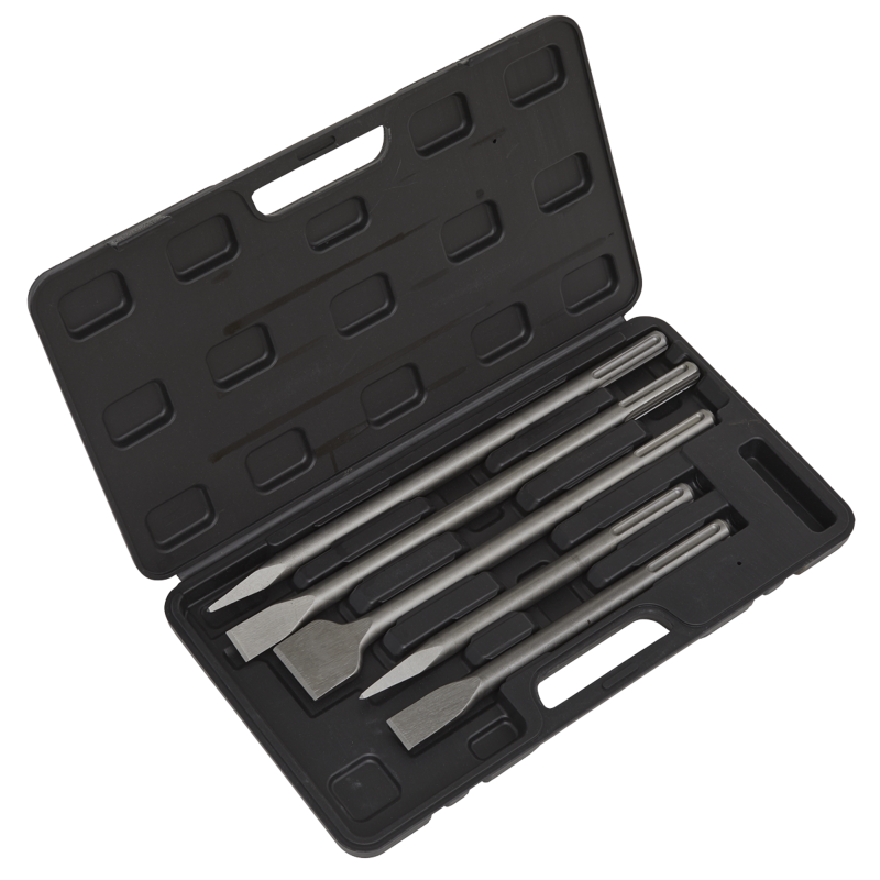 Five SDS MAX chisels supplied in a sturdy storage case.Contents Pointed Chisels 18 x 280, 18 x 400mm, Flat Chisels 24 x 280, 24 x 400, 50 x 360mm.