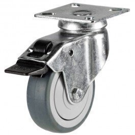 Synthetic non-marking grey rubber on plastic centre with pressed steel bracket.