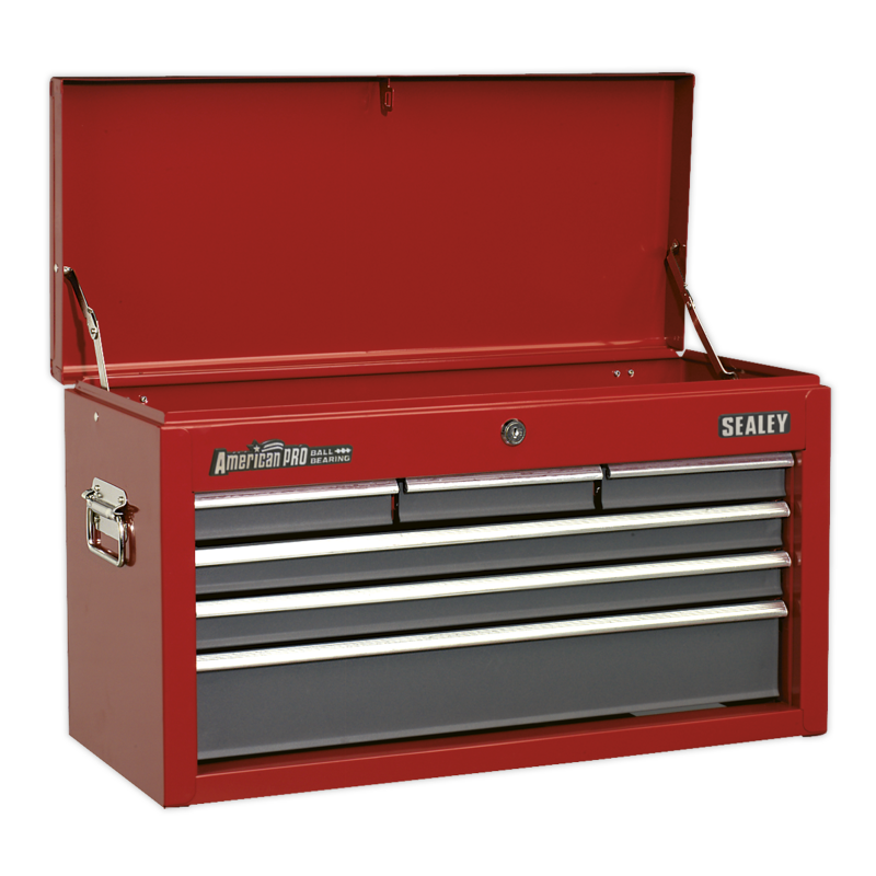 American PRO quality topchest with Hi-Gloss triple baked enamel finish.Features drop-down carry handles, smooth 25mm ball-bearing drawer slides and cylinder lock with locking bars for additional security.