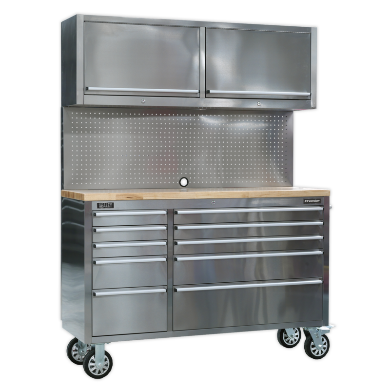 Sealey AP5520SS Mobile Stainless Steel Tool Cabinet 10 Drawer with Backboard 2 Wall Cupboards