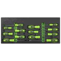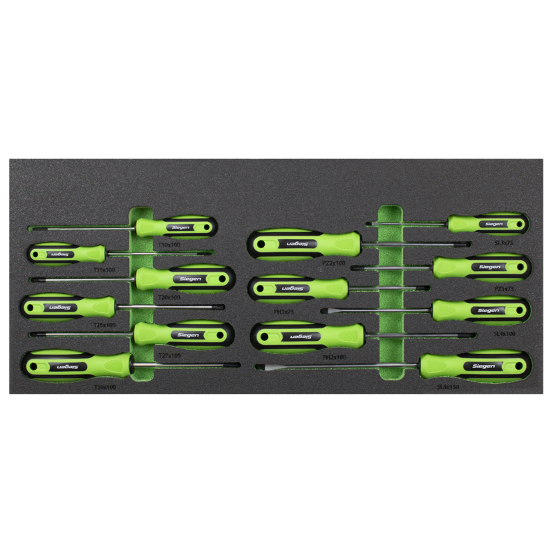 Screwdrivers; Slotted - 3 x 75, 4 x 100, 6 x 150, Phillips - #1 x 75, #2 x 100, Pozi - #1 x 75, #2 x 100, TRX-Star* - T10 x 100, T15 x 100, T20 x 100, T25 x 100, T27 x 100, T30 x 100