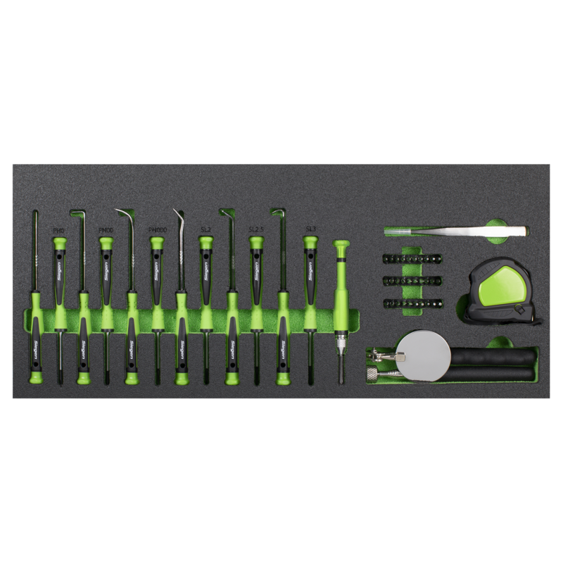 Precision Screwdrivers; Phillips - #0, #00, #000, Slotted - 2, 2.5, 3mm, Pick and Hooks; Straight, Right Angle, Half-Round, Swan Neck, 45°/90° Tip, 40°/45° Tip, Ø50mm Inspection Mirror, 2.2kg Magnetic Pick-Up Tool, 3m Tape Measure, Tweezers, Precision Bit