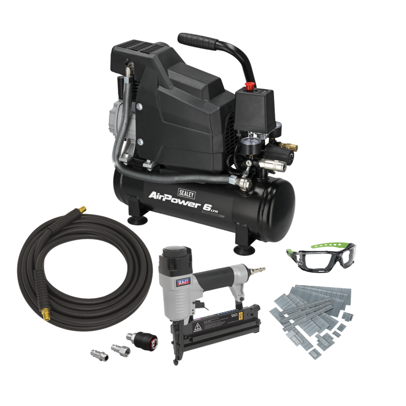 KIT - Includes 6L 2hp Compressor, Air Nailer/Stapler, 5m Air Hose, 3pc Coupling Kit, Safety Spectacles and a pack of 5000 50mm 18SWG nails.