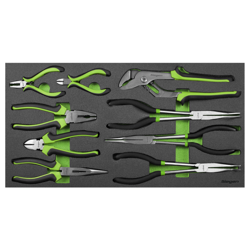 SIEGEN BY SEALEY - Part of the Siegen by Sealey range of quality tools at competitive prices.9PC PLIERS SET WITH TOOL TRAY Contents Includes - 180mm Combination Pliers, 200mm Long Nose Pliers, 150mm Diagonal Side Cutters, 250mm Water Pump Pliers, 130mm Mini Combination Pliers, 125mm Mini Diagonal Cutters, Needle Nose Pliers 275mm Straight, 275mm 90Angle, 275mm 45 Angle.