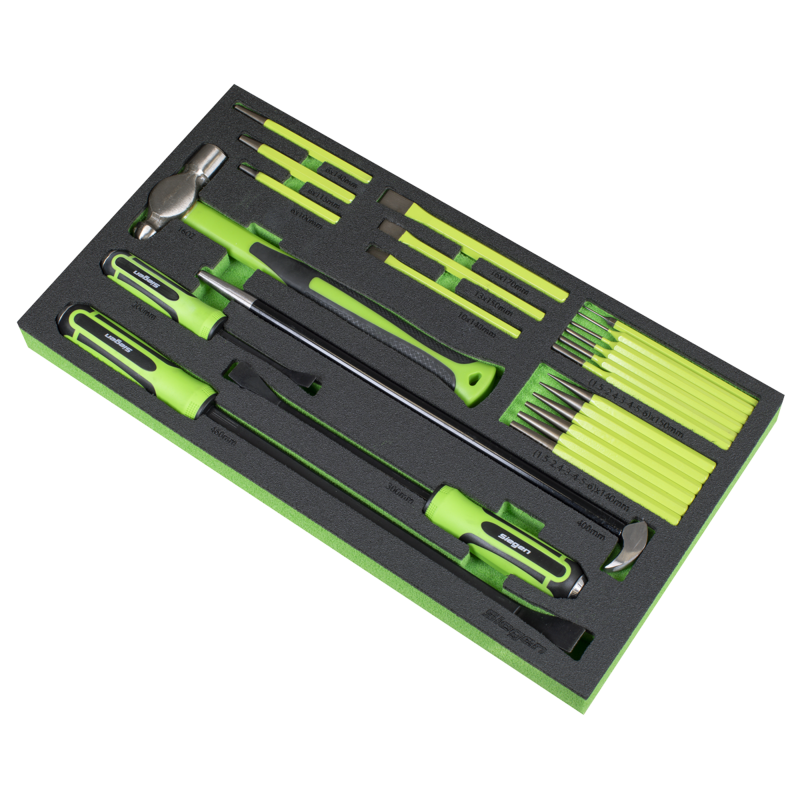 SIEGEN BY SEALEY - Part of the Siegen by Sealey range of quality tools at competitive prices.23PC PRY BAR, HAMMER AND PUNCH SET WITH TOOL TRAY Contents Pry Bars 200, 300, 460mm, 400mm Heel Bar, 16oz Ball Pein Hammer, Cold Chisels 10 x 140, 13 x 150, 16 x 170mm, Taper Punches 1.5 x 140, 2.4 x 140, 3 x 140, 4 x 140, 5 x 140, 6 x 140mm, Pin Punches 1.5 x 150, 2.4 x 150, 3 x 150, 4 x 150, 5 x 150, 6 x 150mm, Centre Punches 6 x 100, 6 x 140, 8 x 115mm.