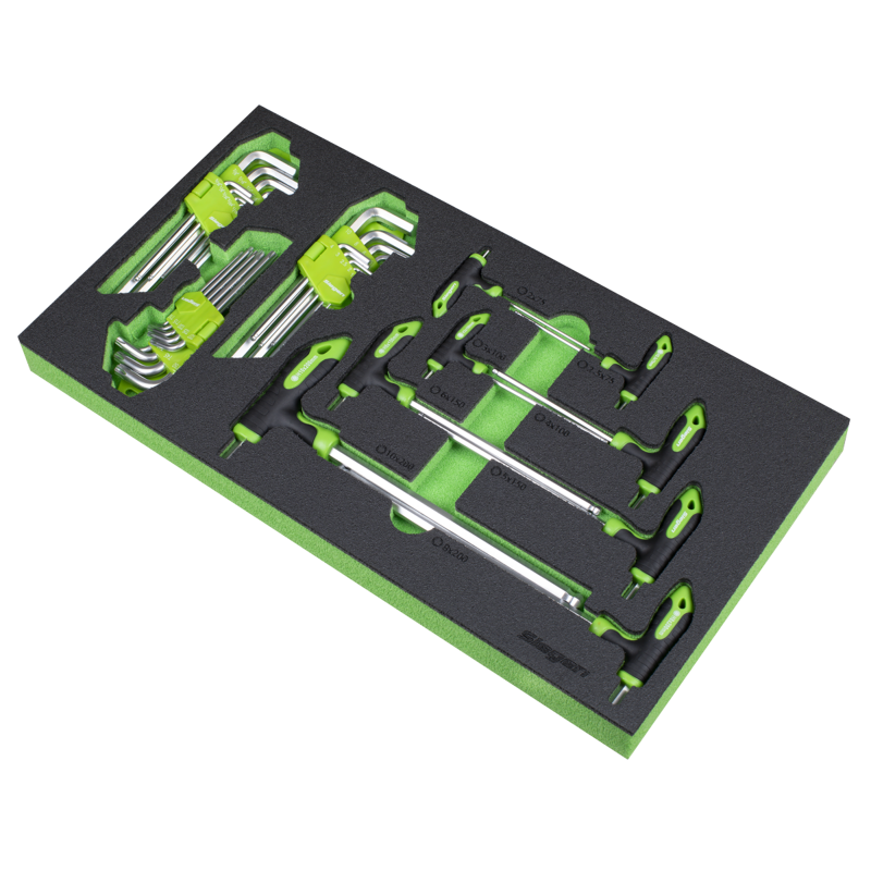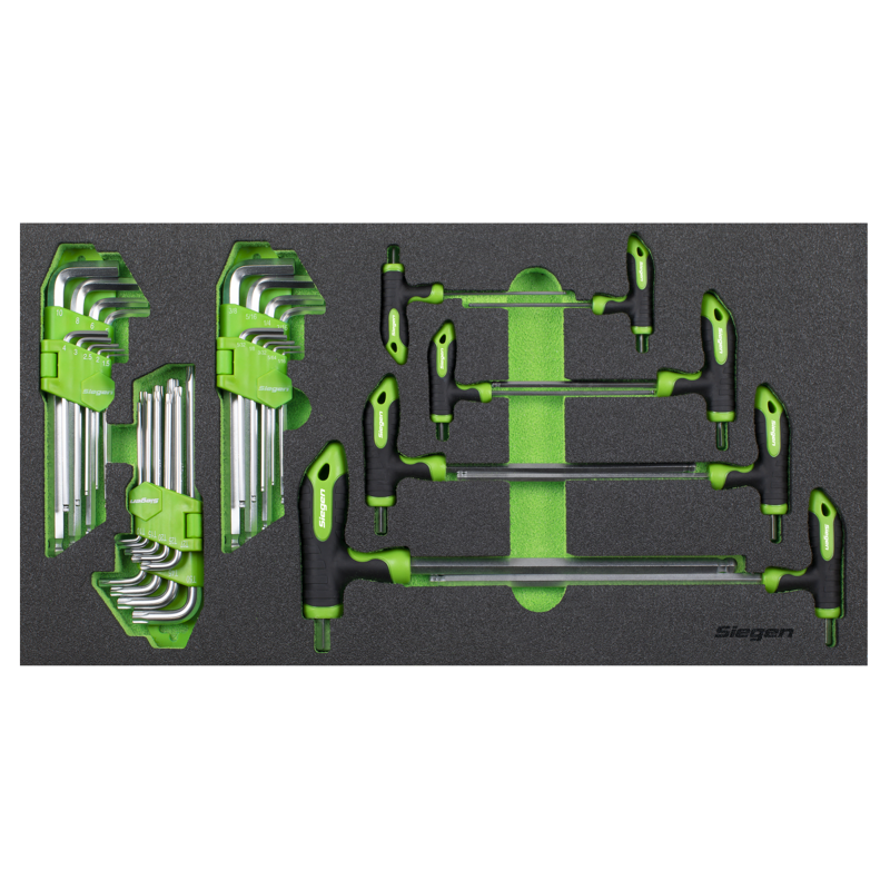 SIEGEN BY SEALEY - Part of the Siegen by Sealey range of quality tools at competitive prices.35PC T-HANDLE AND STANDARD KET SET WITH TOOL TRAY Contents T-Handle Ball-End Hex Keys 2 x 75, 2.5 x 75, 3 x 100, 4 x 100, 5 x 150, 6 x 150, 8 x 200, 10 x 200mm, Ball-End Hex Keys 1.5, 2, 2.5, 3, 4, 5, 6, 8, 10mm, Ball-End Imperial Hex Keys 1/16, 5/64, 3/32, 1/8, 5/32, 3/16, , 5/16, 3/8, TRX-Star Keys T10, T15, T20, T25, T27, T30, T40, T45, T50