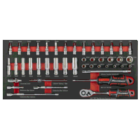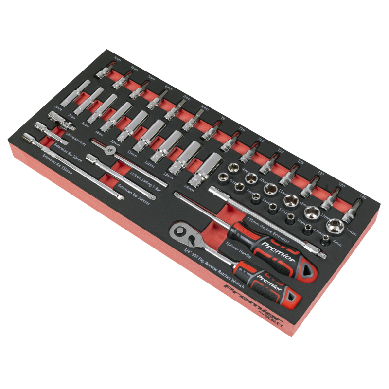 SEALEY PREMIER TOOL TRAYS - One of a comprehensive range of Premier Tool trays designed to fit the Sealey AP24 series and selected Superline PRO Topchests, Rollcabs Workstations.44PC SOCKET SET - Standard Sockets 4, 4.5, 5, 5.5, 6, 7, 8, 9, 10, 11, 12, 13, 14mm, Deep Sockets 6, 7, 8, 9, 10, 11, 12, 13, 14mm, Socket Bits Hex - 3, 4, 5, 6, 7, 8mm, TRX-Star - T8, T10, T15, T20, T25, T27, T30, T40, 90-Tooth Flip Reverse Ratchet Wrench, Spinner Handle, Extension Bars 50, 100, 150mm, 150mm Flexible Extension, 115mm Sliding T-Bar, Universal Joint.
