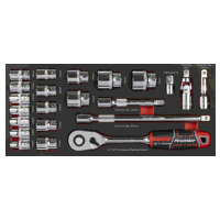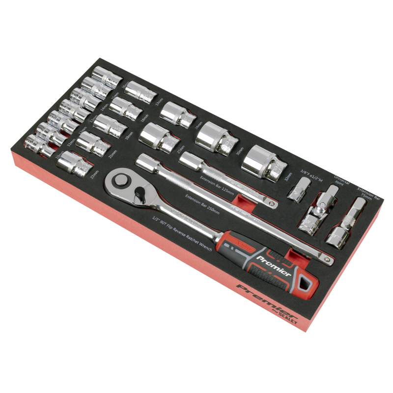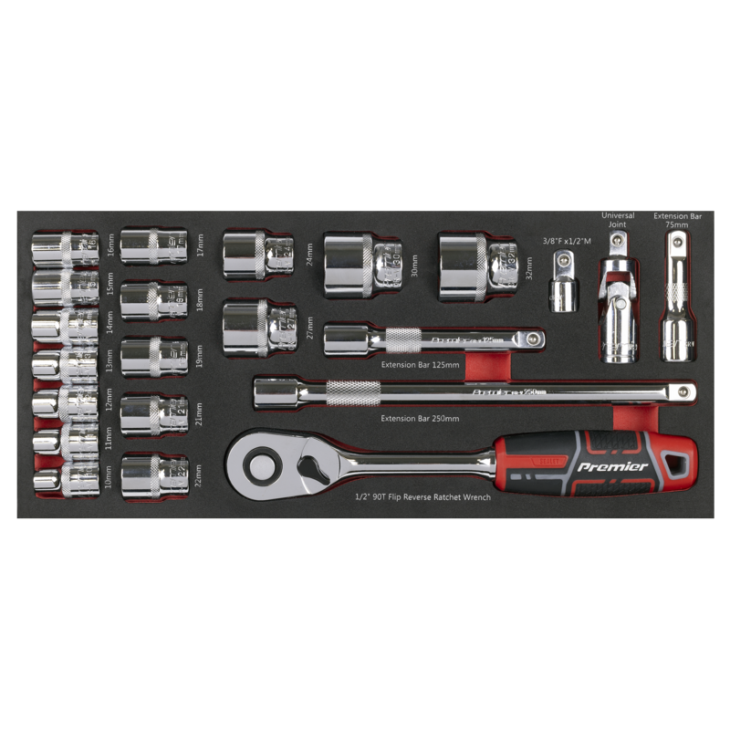 SEALEY PREMIER TOOL TRAYS - One of a comprehensive range of Premier Tool trays designed to fit the Sealey AP24 series and selected Superline PRO Topchests, Rollcabs Workstations.22PC SOCKET SET - Standard Sockets 10, 11, 12, 13, 14, 15, 16, 17, 18, 19, 21, 22, 24, 27, 30, 32mm, 90-Tooth Flip Reverse Ratchet Wrench, Extension Bars 75, 125, 250mm, 3/8(F) - 1/2(M) Adaptor, Universal Joint.