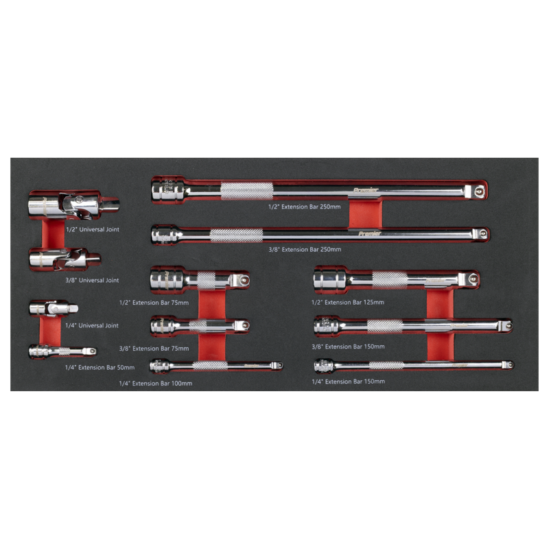 SEALEY PREMIER TOOL TRAYS - One of a comprehensive range of Premier Tool trays designed to fit the Sealey AP24 series and selected Superline PRO Topchests, Rollcabs Workstations.12PC WOBBLE EXTENSION BAR SET - Extension Bars 1/4Sq Drive 50, 100, 150mm, 3/8Sq Drive 75, 150, 250mm, 1/2Sq Drive 75, 125, 250mm, Universal Joints 1/4, 3/8, 1/2Sq Drive.
