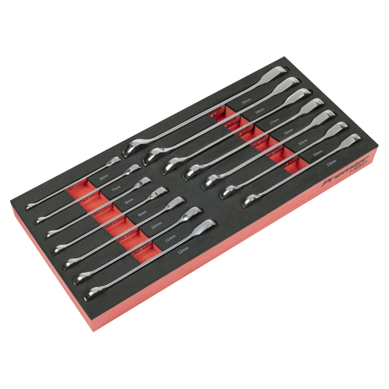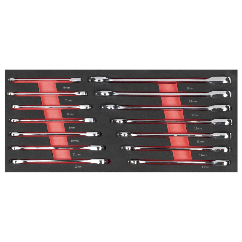 SEALEY PREMIER TOOL TRAYS - One of a comprehensive range of Premier Tool trays designed to fit the Sealey AP24 series and selected Superline PRO Topchests, Rollcabs Workstations.14PC RATCHET SPANNER SET - 6, 7, 8, 9, 10, 11, 12, 13, 14, 15, 16, 17, 18, 19mm.