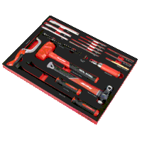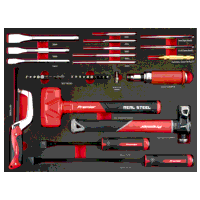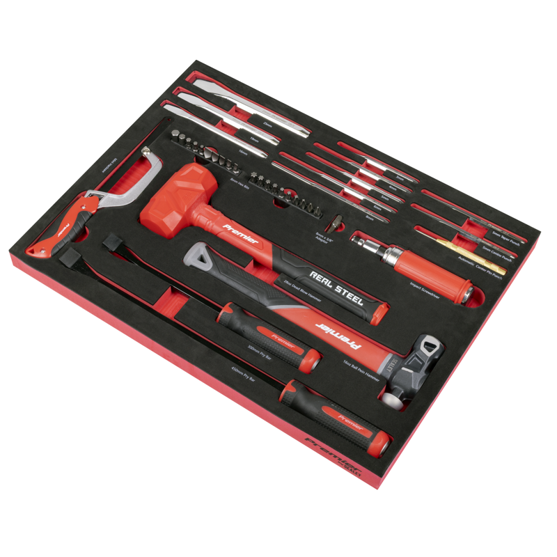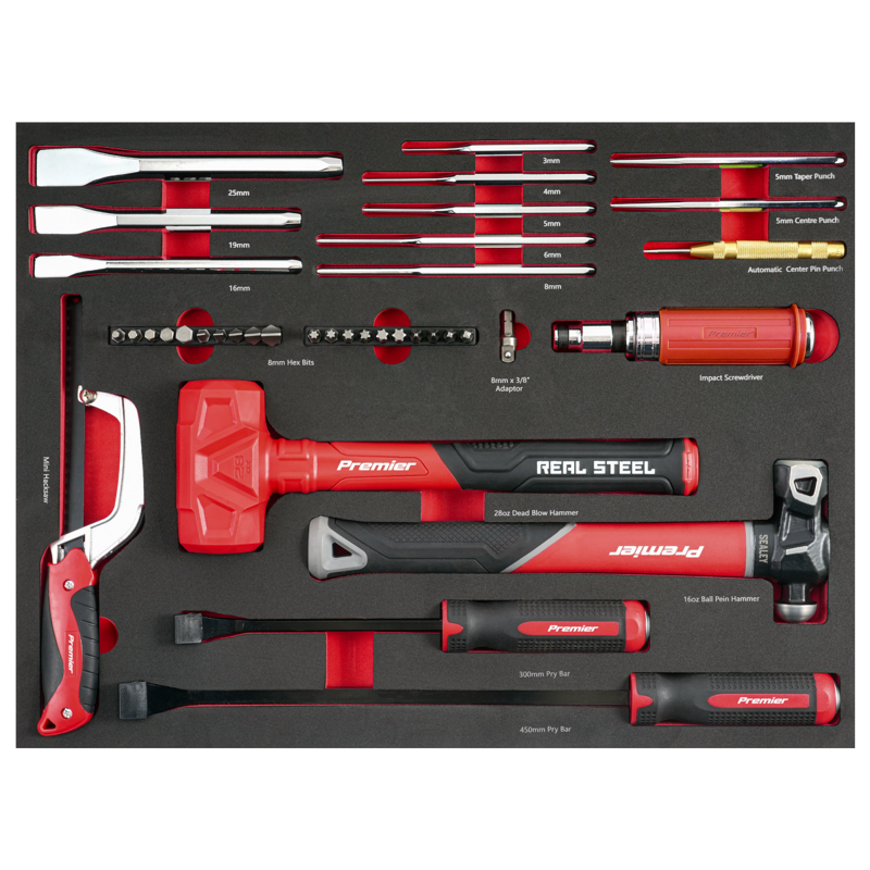 SEALEY PREMIER TOOL TRAYS - One of a comprehensive range of Premier Tool trays designed to fit the Sealey AP24 series and selected Superline PRO Topchests, Rollcabs Workstations.39PC STRIKING, PRY BAR, HACKSHAW, IMPACT SCREWDRIVER SET - 16oz Ball Pein Hammer, 28oz Dead Blow Hammer, Mini Hacksaw, Impact Screwdriver, 1/2 x 8mm Hex Adaptor, 8mm x 3/8 Adaptor, Pry Bars 300mm, 450mm, 8mm Bits (30mm Long) Slotted - 5, 6, 8, 10, 12mm, Phillips - 2 (x2), 3, 4, Hex - 4, 5, 6, 8, 10mm, TRX-Star - T30 (x2), T40 (x2), T45, T50, Parallel Pin Punches 3, 4, 5, 6, 8mm, 5mm Centre Punch, Cold Chisels 16, 19, 25mm, 5mm Taper Punch, Automatic Centre Pin Punch.