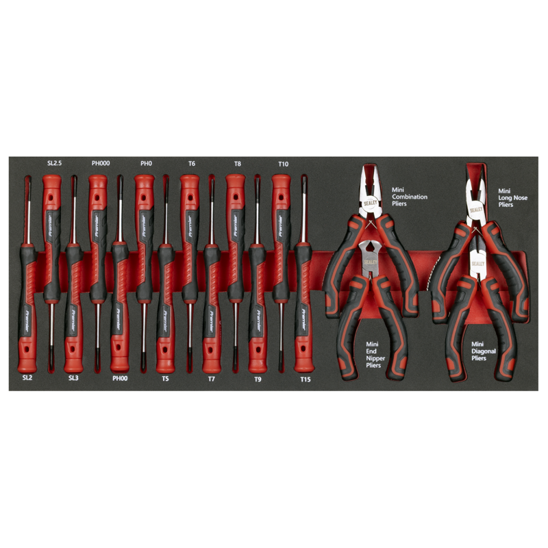 SEALEY PREMIER TOOL TRAYS - One of a comprehensive range of Premier Tool trays designed to fit the Sealey AP24 series and selected Superline PRO Topchests, Rollcabs Workstations.17PC PRECISION SCREWDRIVER AND MINI PLIERS SET - Precision Screwdrivers Slotted - 2, 2.5, 3mm, Phillips - 000, 00, 0, TRX-Star - T5, T6, T7, T8, T9, T10, T15, Mini Combination Pliers, Mini Long Nose Pliers, Mini Side Cutters, Mini End Nipper Pliers.
